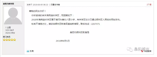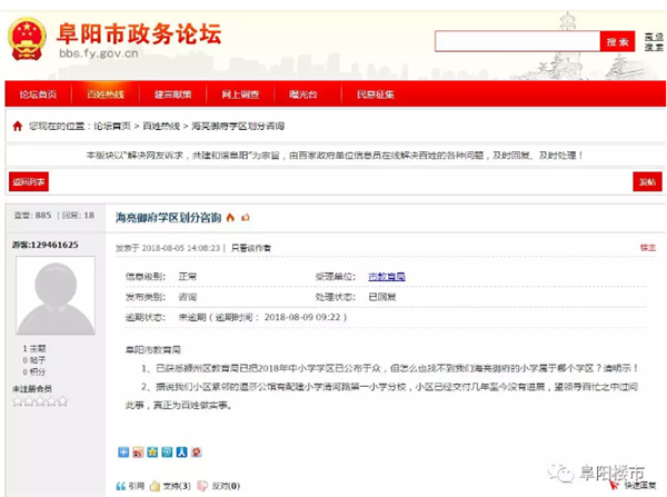 近日,有网友在阜阳市政务论坛发帖咨询海亮御府学区问题:阜阳市教育局 1、已获悉颍州区教育局已把2018年中小学学区已公布于众,但怎么也找不到我们海亮御