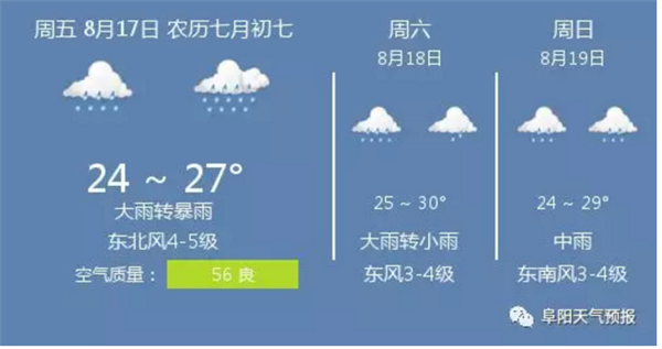 8月17日阜阳天气:大雨转暴雨,温度 24 ~ 27℃,东北风4-5级,日出时间 05:41,日落时间 19:01。实时:气温 24℃,北风4级,湿度 94%,气压 1006 hPa。安徽省阜阳市蓝色